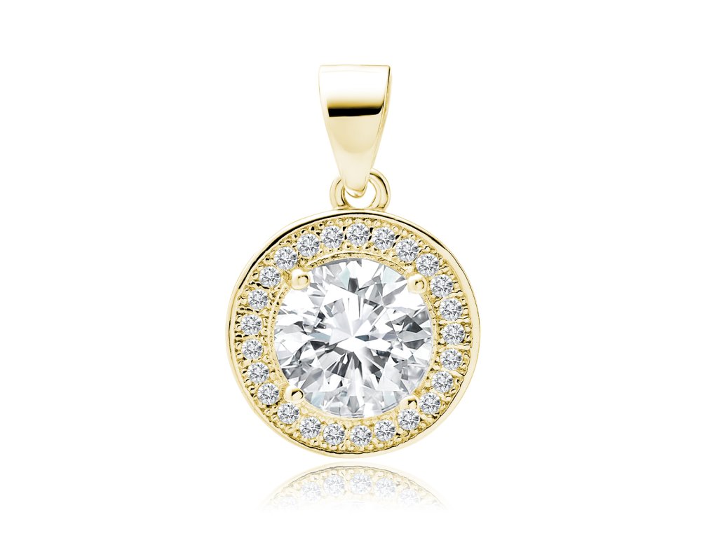Tento přívěsek staví na jednoduché, ale velmi efektní kombinaci. Uprostřed je výrazný čirý kámen s bohatým brusem, který zachycuje světlo a vytváří jemné odlesky při každém pohybu. Kolem něj je osazen kruh drobných kamenů, které celý motiv ještě více rozzáří. Pozlacené stříbro dodává šperku krásný teplý tón.