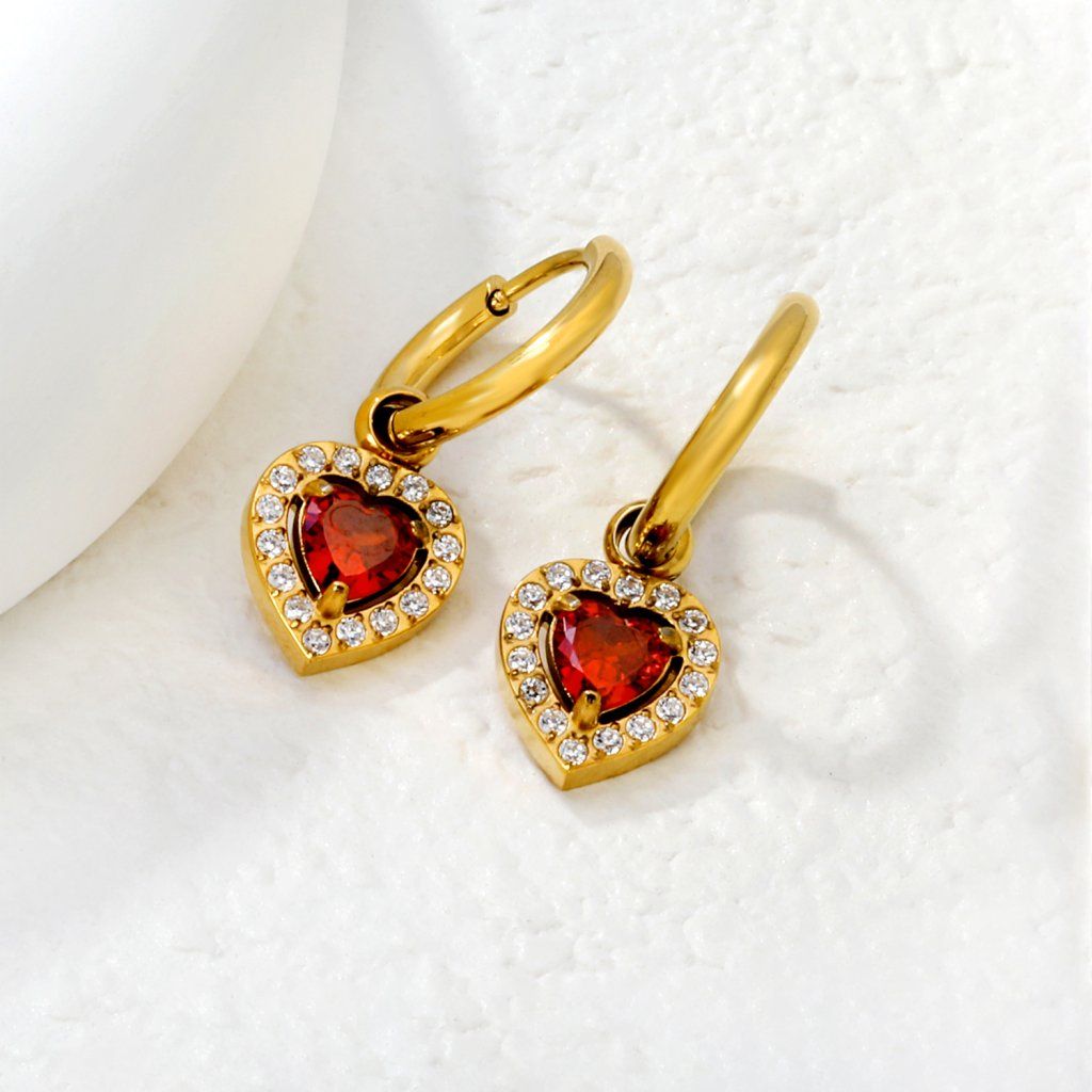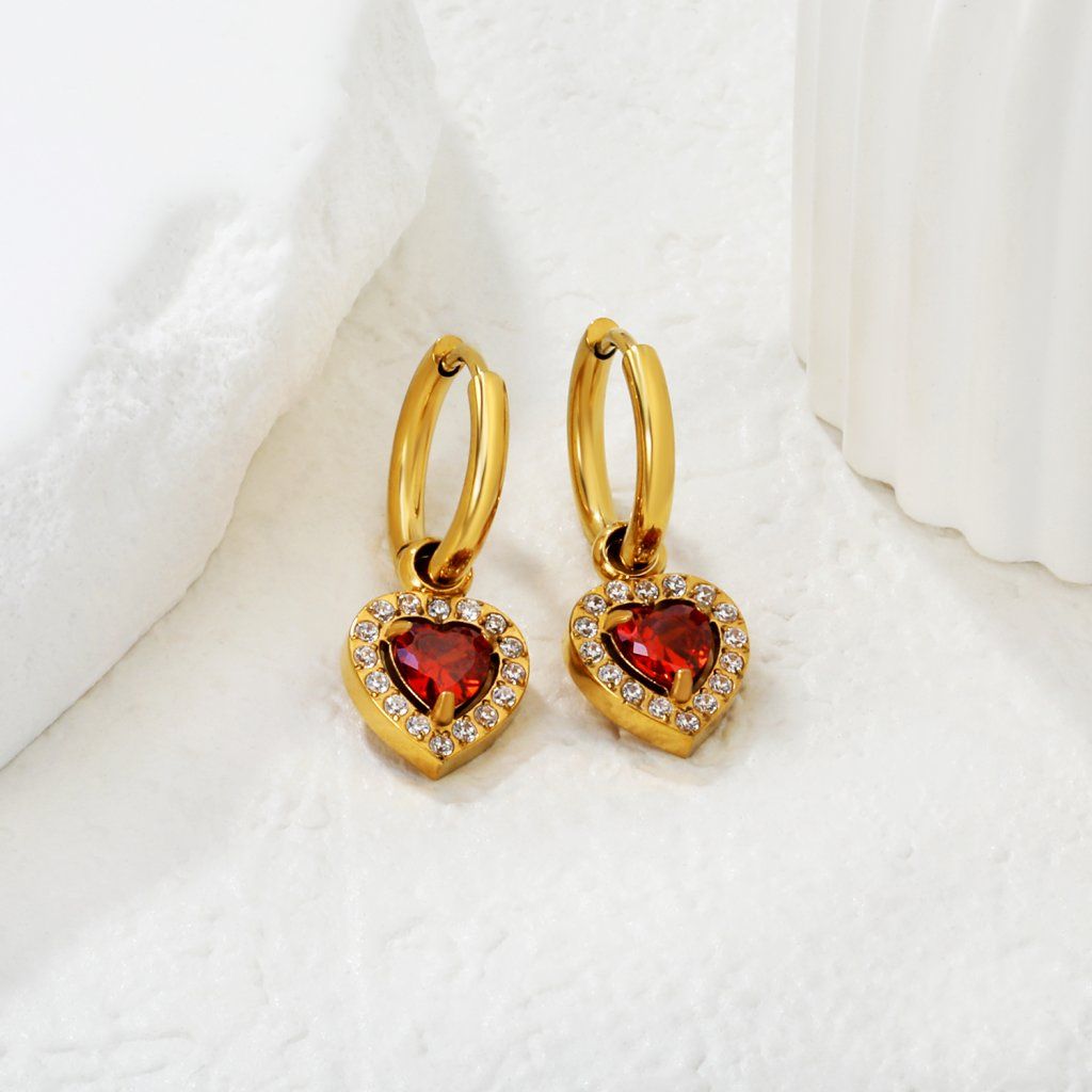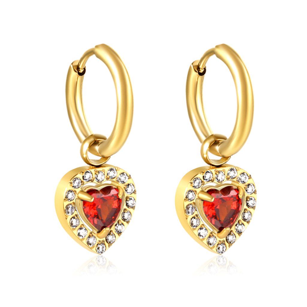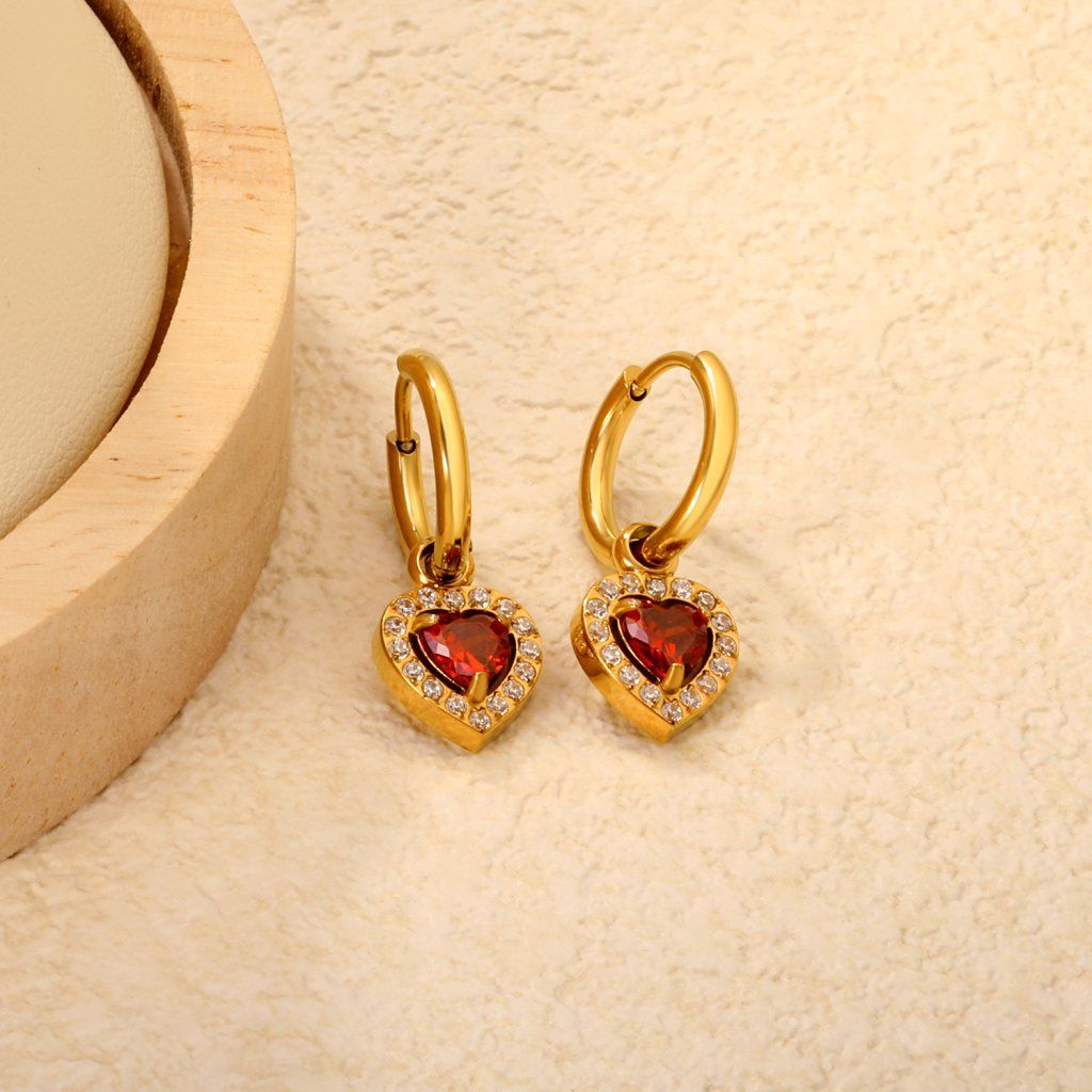 Náušnice s červeným srdcem v pozlaceném provedení působí výrazněji díky kombinaci barev. Srdce je doplněné drobnými kamínky, které zvýrazňují jeho tvar. Kroužek je menší a dobře sedí na uchu. Zapínání je řešené prakticky a drží spolehlivě. Výraznější varianta mezi jemnějšími šperky.