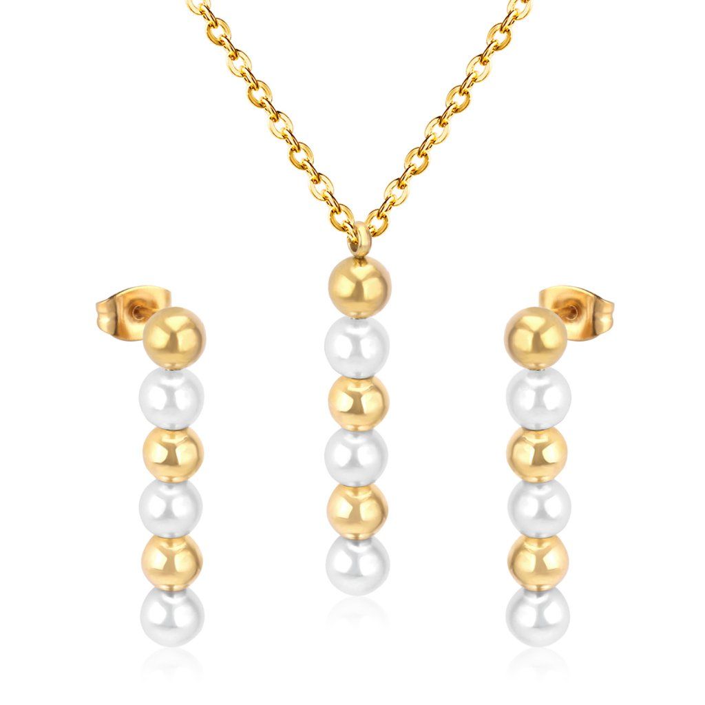 Tato sada kombinuje náhrdelník a náušnice s motivem perliček v jednotném stylu. Zlatý tón dodává šperkům teplejší vzhled, zatímco perly zůstávají hlavním prvkem. Řetízek o délce 40 + 5 cm umožňuje upravit délku podle výstřihu. Náušnice jsou řešené na puzetu, takže se pohodlně nosí během dne. Působí upraveně, aniž by byly výrazné.