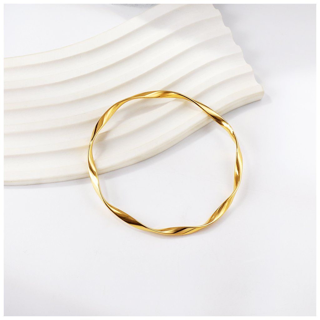 Pevný náramek o průměru 6,3 cm. Tvar náramku je zatočený, takže světlo dopadá na povrch pokaždé jinak. Linie není přímá, ale lehce zkroucená. Nemá žádné přívěsky ani kameny. Vyniká zde samotný tvar.