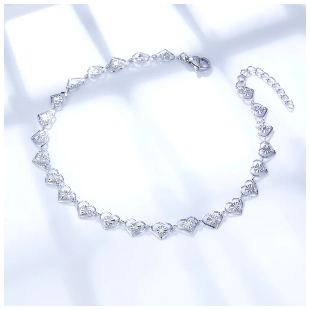 Motiv srdce se opakuje po celé délce řetízku. Každý prvek je malý a pevně spojený s řetízkem. Konstrukce je tenká a lehká na nošení. Bez kamínků a bez pohyblivých částí drží jednoduchý tvar. Řetízek lze nastavit v délce 21 - 24 cm.